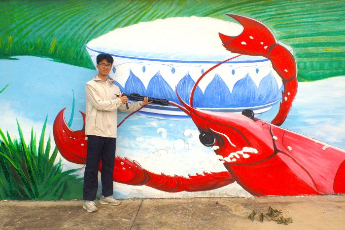 三联村,这里的“稻虾共生”生态农业基地实现一水两用、一田双收。村中墙上的彩绘生动再现了“稻虾共生”的特色。