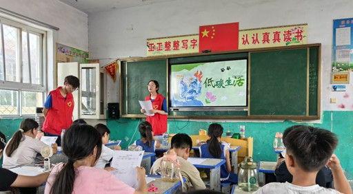 环保的未来在青少年。小分队走进睢阳区宋集镇魏庄小学,为50余名留守儿童开设“低碳先锋”科普课堂。课程从碳足迹计算开始,队员们引导孩子们计算日常出行、用电等行为产生的碳排放量,形成个人碳账本,并通过互动问答学习减碳技巧。“我知道啦!洗菜水浇花,能省水又降碳!”三年级一位同学兴奋分享。随后的科普环节,队员潘圆圆结合动画短片与实物展示,深入浅出地讲解垃圾分类与资源循环利用知识,将“碳达峰、碳中和”目标融入生活场景。这堂融合计算与科普的课堂,将绿色理念深植童心。