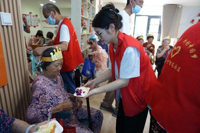 游戏结束后,生日蛋糕登场。社区工作人员与师生代表为老人们佩戴寿星帽、点燃蜡烛。在《生日快乐》歌声中,老人们共同许愿、吹灭蜡烛,随后一起切分蛋糕。工作人员与师生分工分发蛋糕,老人们品尝着甜点,脸上满是笑容。