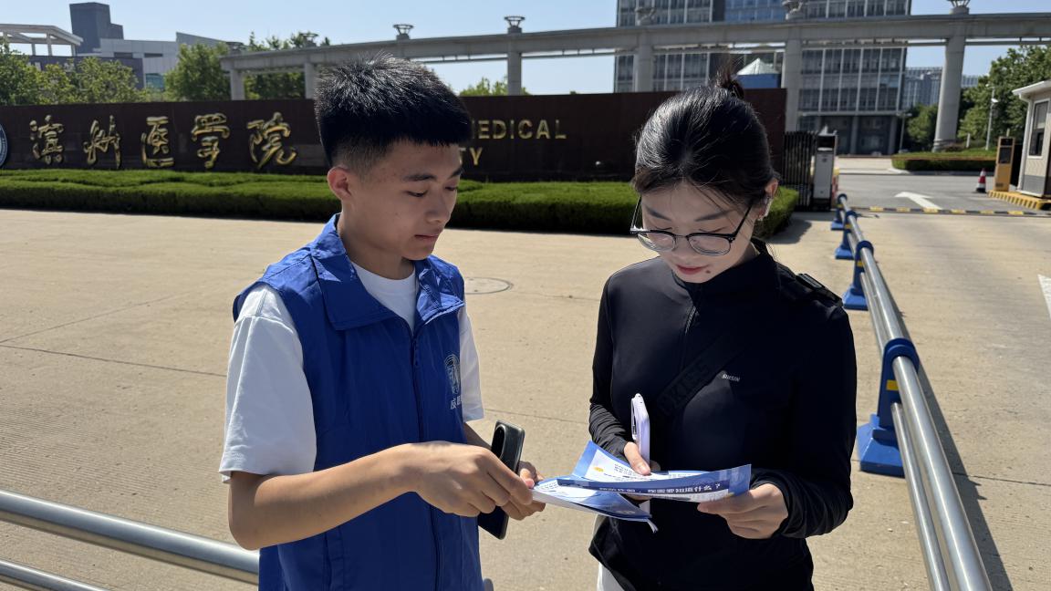 (图为实践队成员向滨州医学院同学科普AI防诈知识 “法盾防诈”实践队 王一诺 供图)