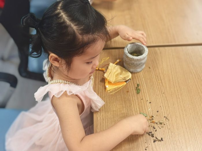 香囊布料在桌上铺开时,像突然绽放了一片彩虹。孩子们捏着艾叶的动作格外轻,仿佛怕惊扰了叶片里藏着的清香。穿蓝背心的小男孩把苍术和薄荷层层叠叠塞进去,说要做个“会吹凉风的魔法袋”;扎马步的小调皮鬼把艾草搓成小球,说要当“驱蚊小炮弹”。有个文静的女孩专注地用丝线缠绕香囊边缘,忽然抬头问:“这些草晒干了还会做梦吗?”我望着她睫毛上沾着的陈皮碎屑,忽然觉得,中医的传承从来不是背诵药方,而是让草木在孩子心里扎下会发芽的童话。