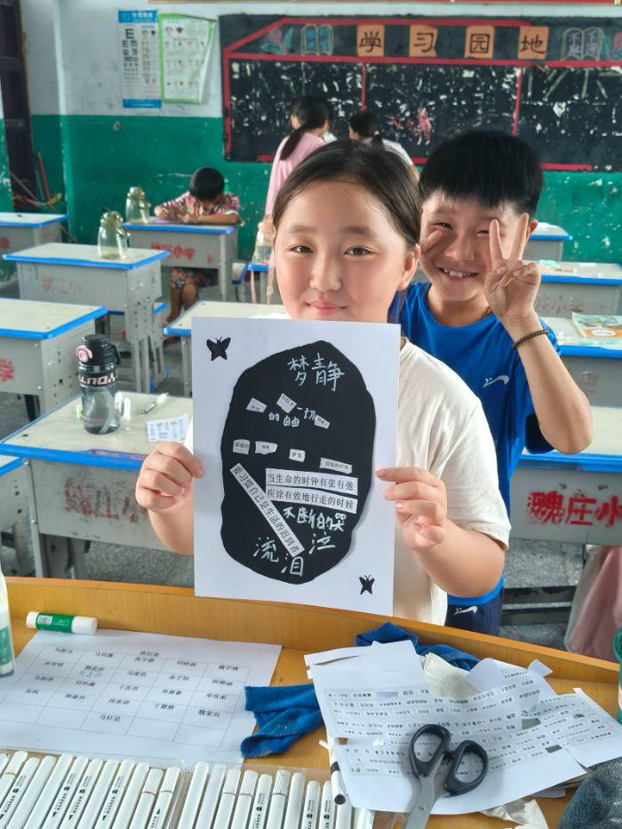 7月22号下午,河南省商丘市魏庄小学的教室里洋溢着一片欢乐而温馨的氛围。在支教团成员都语菲老师的带领下,小朋友们迎来了一堂充满创意与诗意的拼接诗课。剪刀、彩纸、胶水、诗句……孩子们兴奋地用他们灵巧的双手,剪贴出一个个属于自己的独特而富有诗意的世界。