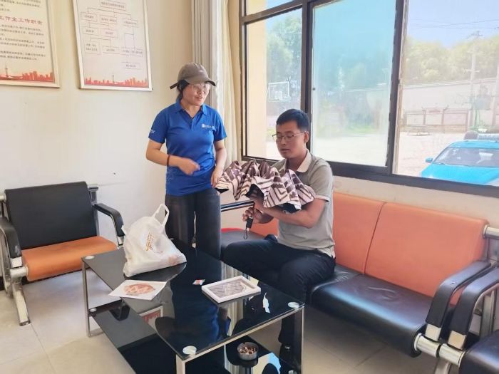 (实践队员向马家窑村党支部书记丁书记介绍文创。范凯妮摄)