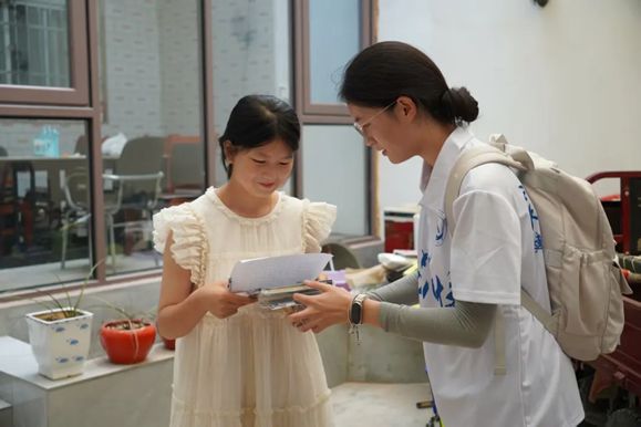 图为心协成员询问女孩心理健康情况。秦梦茹摄