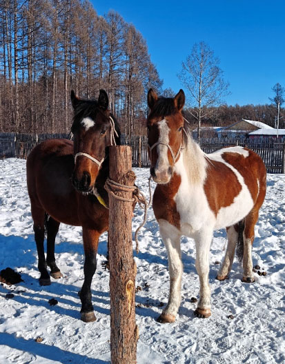回三姨家的路上,我想着家里为数不多的老照片,其中印象最深的就是姥爷骑着马带着猎犬在雪地里溅起一簇簇雪花的情景,这也是为什么参观马场在我的探险计划之中,我觉得姥爷正在天上看着我呢,这个时候三姨过来说要带我去感受一下鄂伦春的马,我们四处打听了一下,最终找到三姨的朋友里有一个付姨父,他家里有马场。第二天我们就赶往付姨父家,付姨父家有很多马,大部分都在远一点的草原上,他家里只留了几匹他最爱的马,我第一次见到鄂伦春马,它们灵动俊逸,毛发很密很厚,摸起来毛绒绒的,时不时跺跺脚,每一匹都有自己的脾气。